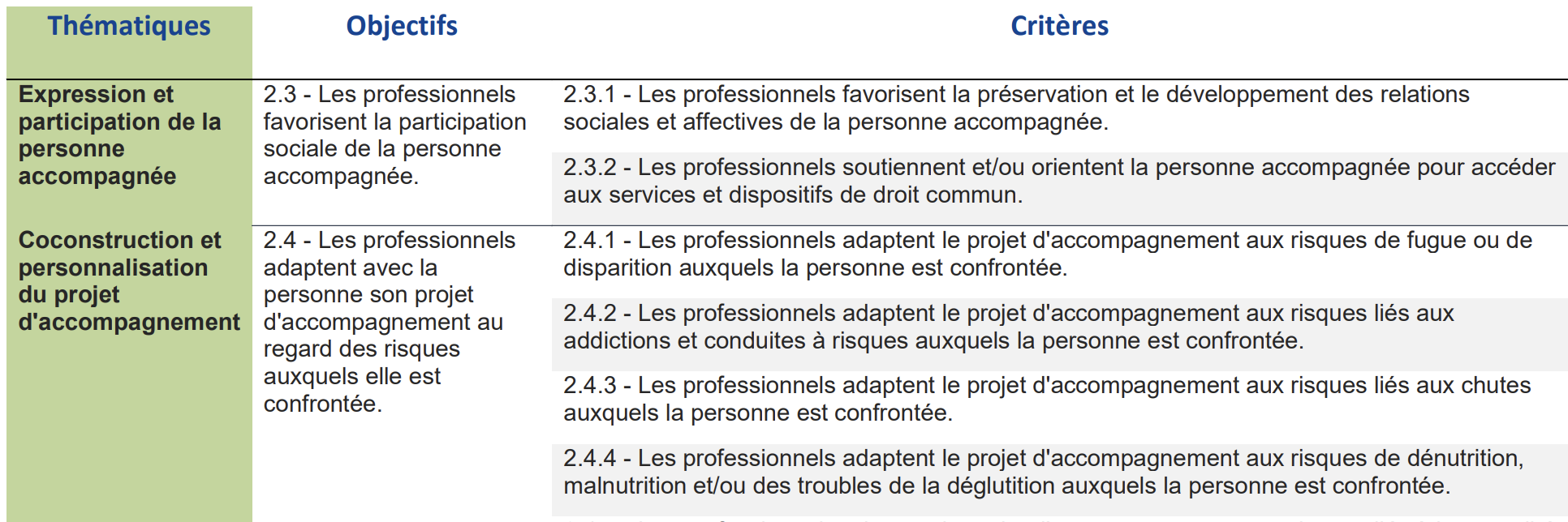 - 139 critères standards : ils correspondent aux attendus classiques de l'évaluation et couvrent l'ensemble des dimensions de votre activité (projet d'établissement, accompagnement, gestion des risques, ressources humaines, etc.).
